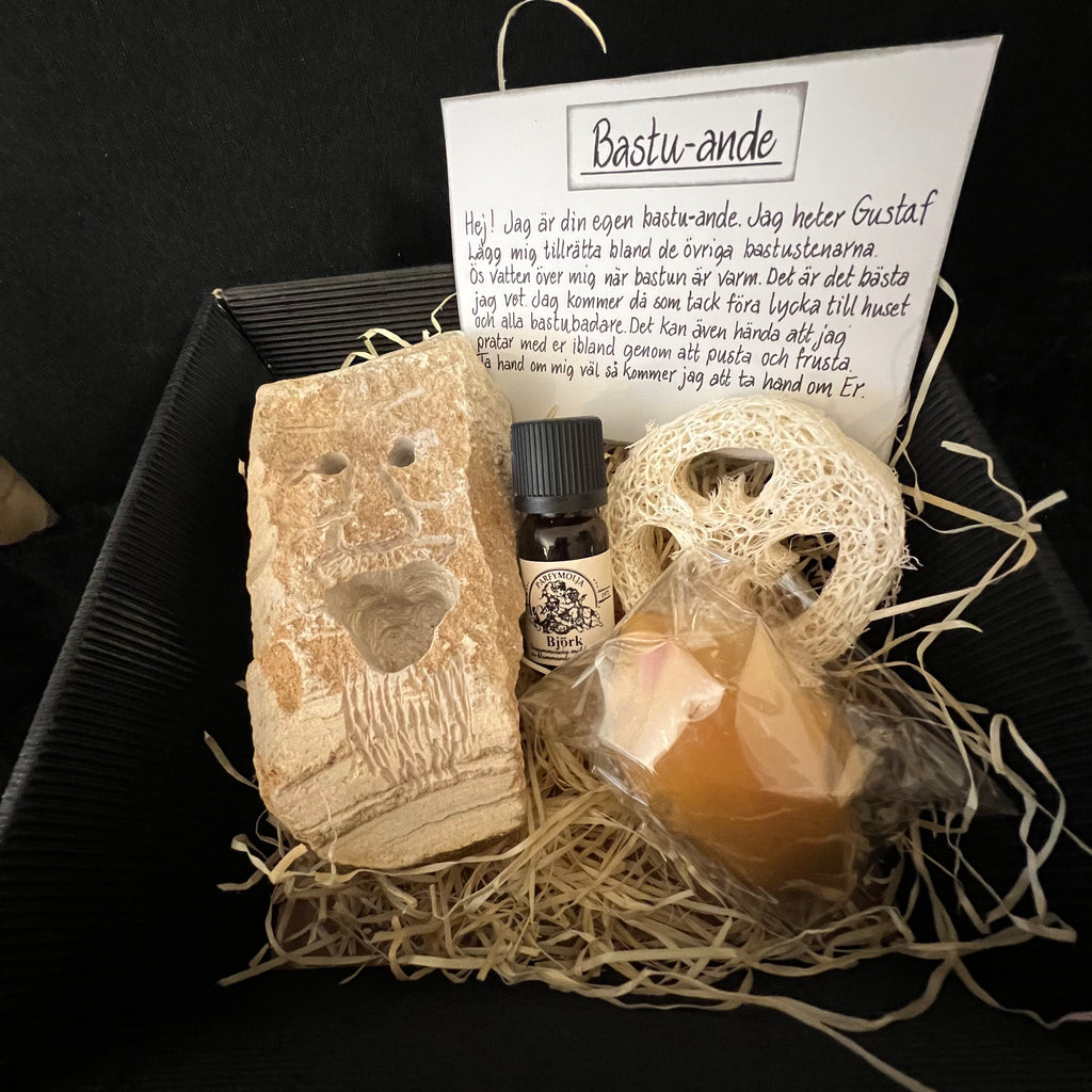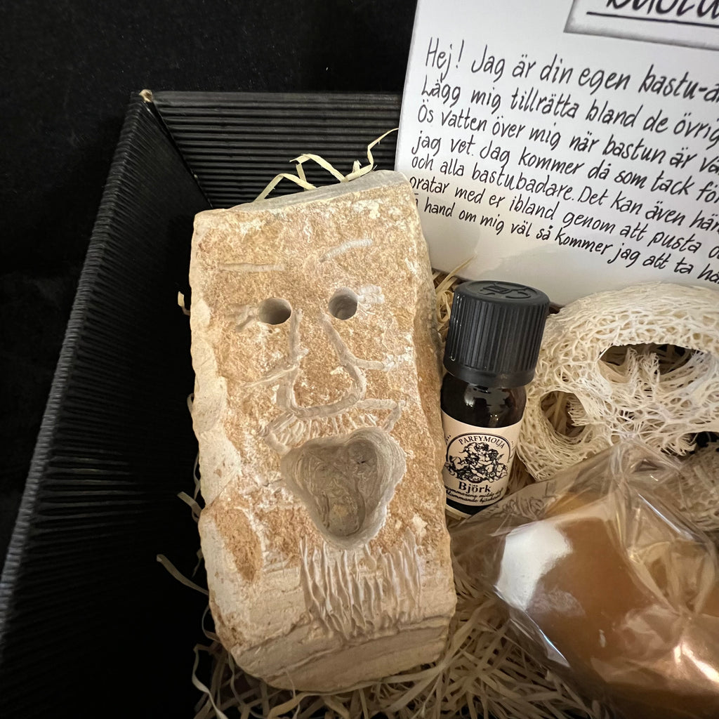Björkdoft att ha i vattnet följer med alla bastuandar och i vissa lådor finns även mysiga tvålar tillverkade av ekologiska naturprodukter. Naturskrubb i linnefrotté eller luffagurka finns även i vissa.