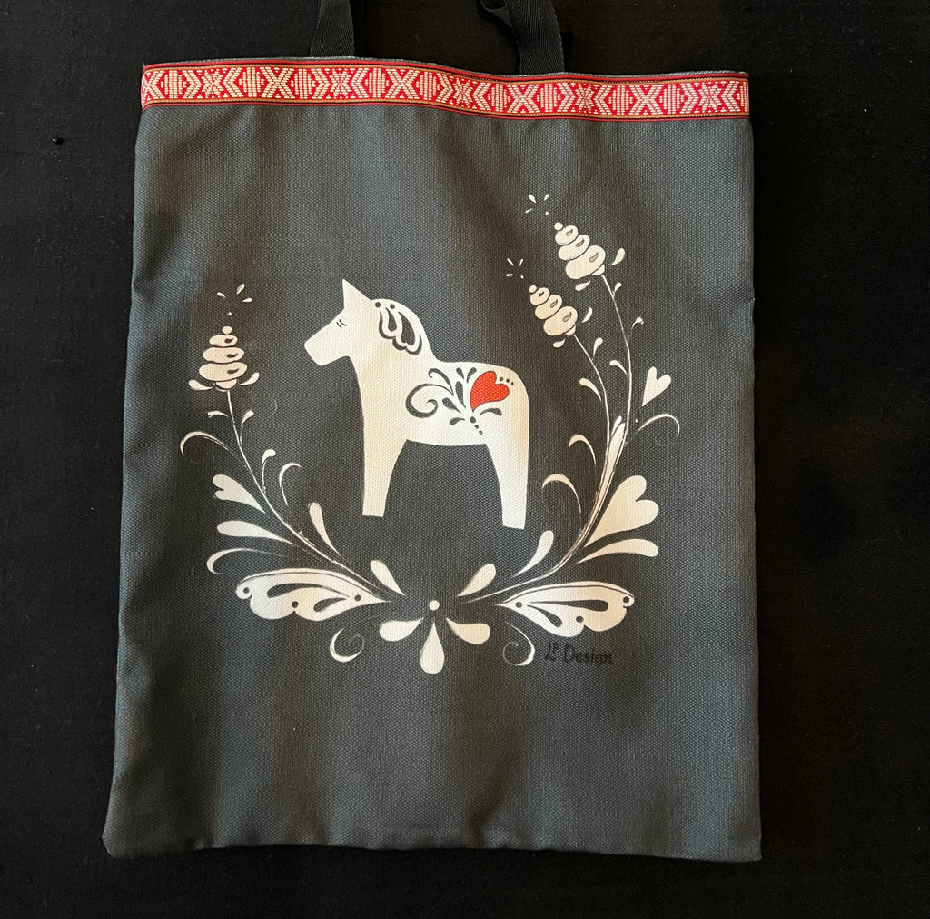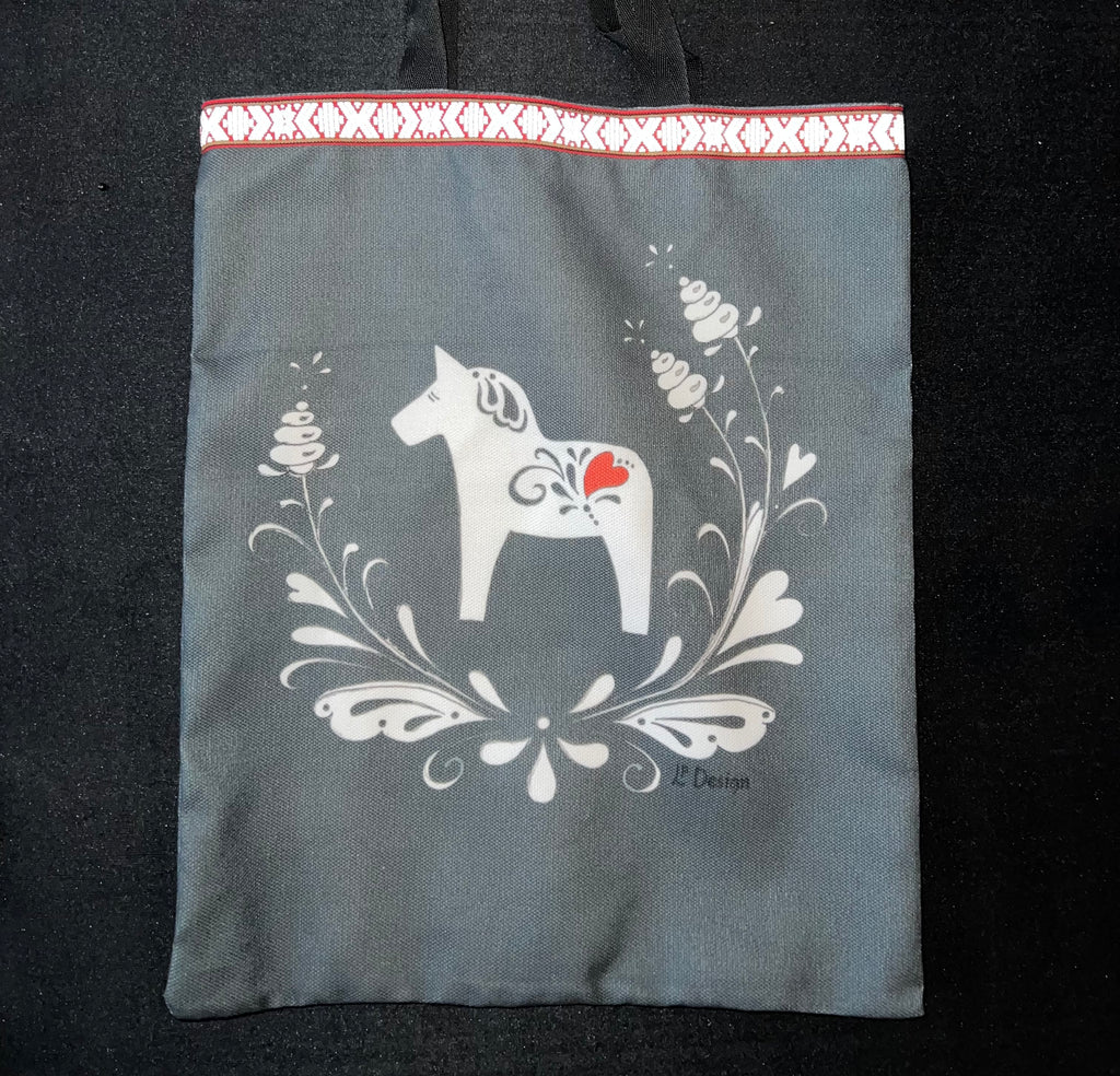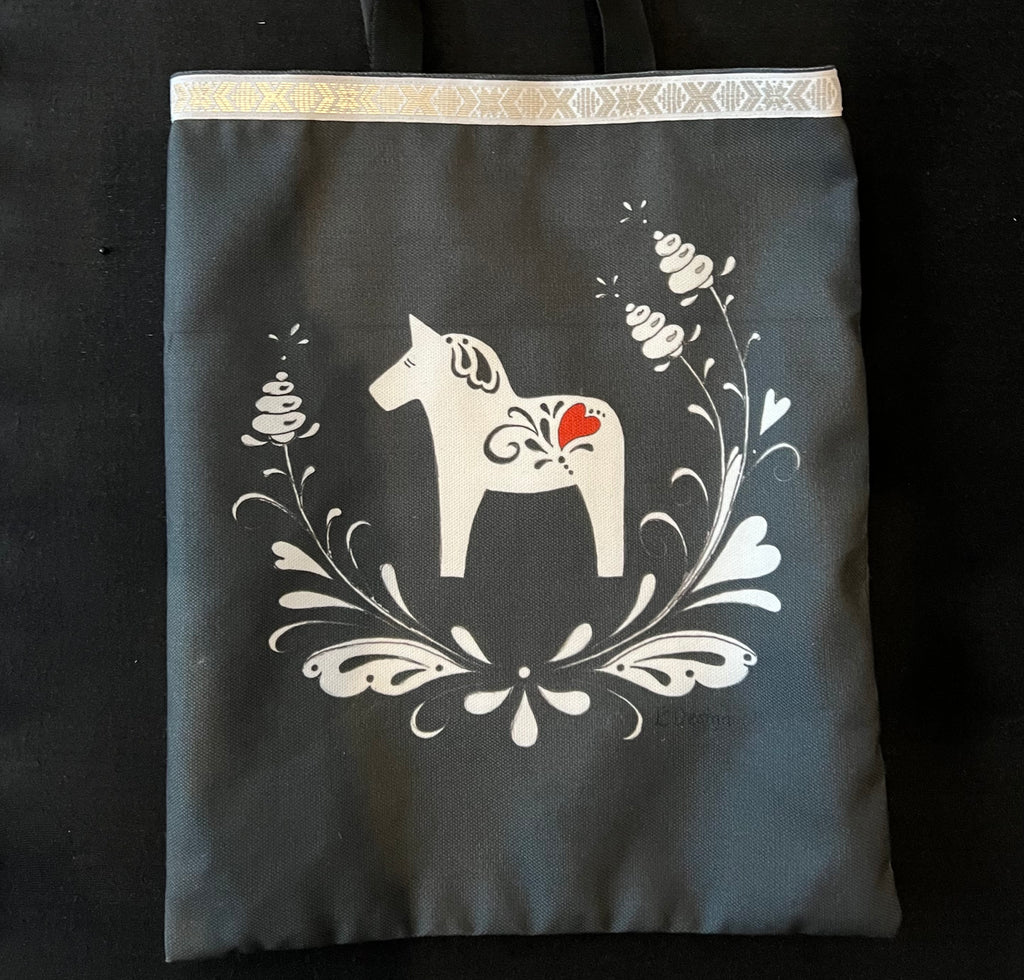 Denna praktiska väska med både korta och halvlånga band är perfekt att slänga över axeln. Vårt fina motiv som pryder väskan med sin fina dalahäst och kurbits hittar du även på flera produkter hos oss.